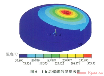 安全閥的熱輻射條件是根據相關國外規(guī)范[14],熱輻射能量為32kW/m2,安全閥高度離穹頂約l6m,持火燃燒6h?;馂臒彷椛涫撬矐B(tài)熱分析,即熱輻射隨著時間發(fā)生的。為了建立有限元模型的初始條件,在火災將要發(fā)生的ls時,執(zhí)行穩(wěn)態(tài)熱分析,得到儲罐的溫度分布情況。然后從1s~6h考慮安全閥火災的瞬態(tài)熱輻射,給安全閥孤立節(jié)點施加熱輻射能量,使儲罐獲得相應的背景輻射溫度。模型還要考慮通風情況下的強制對流,施加根據努賽爾系數計算得出的對流換熱系數,并考慮外部環(huán)境溫度的約束條件。