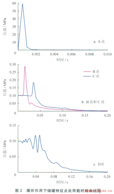 儲罐各特征點處在爆炸作用下的荷載時程曲線如圖2所示,由于E、F兩點距離爆心較遠,其超壓現(xiàn)象不明顯,本文并未示出這兩點的相應曲線。比較前3個特征點的荷載時程曲線,其極值分別為59.15MPa、0.28MPa和0.18MPa;峰值出現(xiàn)時間分別為0.5ms、15.1ms和35ms;正壓區(qū)作用時間分別為2ms、8ms和10.5ms。本文參考文獻[14]中給出了裝藥密度為1630kg/m3時TNT炸藥所形成空氣沖擊波的初始值,其初始波后壓力為54.35MPa,傳播速度為6450m/s.