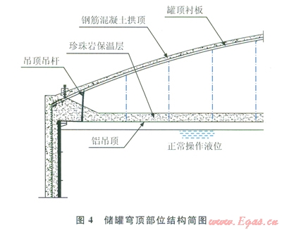 從圖4中可以看出,穹頂結(jié)構(gòu)上部僅由外部鋼筋混凝土拱頂和厚度為6mm的罐頂襯板組成,其下懸掛吊桿和鋁吊頂,鋁吊頂上填充珍珠巖或玻璃棉保溫層,鋁吊頂距離正常操作液位約500mm。如上所述,如果外罐頂出現(xiàn)爆坑,沖擊波進入罐內(nèi),雖然其沖擊荷載已急速衰減,但沖擊波會對鋁吊頂上部的保溫層造成破壞,引起火災、爆炸等次生災害。