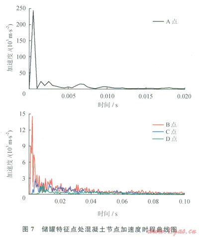 圖7為儲罐特征點A~D處混凝土節(jié)點加速度時程曲線。由圖7可見,各點加速度峰值均出現(xiàn)在初始加載階段,而后反應大幅下降,并伴有鋸齒形劇烈振蕩,振蕩現(xiàn)象隨著爆心距的增加而愈加劇烈。這一現(xiàn)象的原因為炸藥爆炸后給儲罐穹頂一個極大的初始加速度荷載,引起各特征點處加速度出現(xiàn)一個脈沖峰值,而后出現(xiàn)的鋸齒形振蕩則是由儲罐的自振引起的。將圖5~7與圖2的荷載時程曲線相對比,叮以看出,沖擊波波陣面的傳播對混凝土單元的應力影響很大,但對于其加速度響應影響不大。以C點為例,其荷載峰值出現(xiàn)在35ms處,此時其相應的應力出現(xiàn)了一個脈沖峰值,而其加速度響應未有明顯波動。