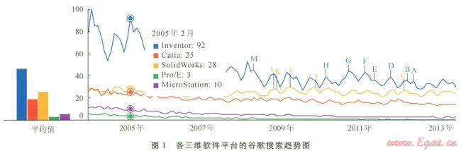 Inventor作為Autodesk公司推出的一款三維可視化軟件,具有三維建模、協(xié)同工作、信息管理和技術(shù)支持等強大功能,在該平臺可以實現(xiàn)創(chuàng)建三維模型、二維工程圖,其具有的連接網(wǎng)絡(luò)功能可以進行同項目組員間的協(xié)同,為同項目組人員間數(shù)據(jù)共享和思想交流提供了極大方便。另外,通過谷歌趨勢檢索比較圖l,從另一個側(cè)面也反映出了該軟件具有更高的關(guān)注度和更大的應(yīng)用范圍。