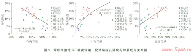 如圖5所示,XF區(qū)黃流組一段儲(chǔ)層的儲(chǔ)集性能與陸源碎屑成分關(guān)系密切,石英含量愈低、長(zhǎng)石與巖屑含量愈高,視面孔率愈高。在黃流組一段沉積時(shí)期,源于昆嵩隆起XFl3-1氣田西部、XFl3-2氣田、XF29-l構(gòu)造西部砂巖,巖屑平均含量在11.8%~l6.2%,以巖屑石英砂巖為主,面孔率平均值為13.9%~l5.6%,以海南隆起物源為主的XFl3-1氣田東部、XF29-1構(gòu)造東部以及XFl-l氣田,各井砂巖石英平均含量大于90%,長(zhǎng)石、巖屑含量低,分別為2.5%~3.8%、3.9%~7.7%,孔隙發(fā)育差,視面孔率僅為2.4%~7.0%(表1)。