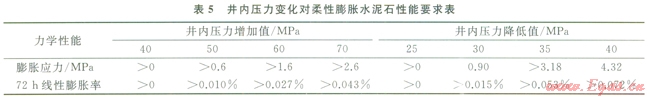 井下作業(yè)公司柔性自應(yīng)力水泥石能在高圍壓條件下膨脹,產(chǎn)生0.53.0MPa膨脹壓應(yīng)力,楊氏模量在57GPa,泊松比約為0.19,抗拉強(qiáng)度在2.53.5MPa。當(dāng)固井后井內(nèi)壓力增加時(shí),通過(guò)釋放壓縮應(yīng)力,減小水泥環(huán)周向拉應(yīng)力,避免拉伸破壞,同時(shí)外觀體積微膨脹,可阻止微環(huán)隙形成。由公式(1)、(2)計(jì)算出表5所示不同井內(nèi)壓力變化情況下柔性膨脹水泥石體積膨脹要求。該水泥漿體系在相國(guó)寺儲(chǔ)氣庫(kù)井技術(shù)套管、頁(yè)巖氣井的油層套管固井中得到了成功應(yīng)用,固井質(zhì)量?jī)?yōu)質(zhì),在經(jīng)過(guò)試壓、大型體積壓裂作業(yè)后,環(huán)空封固質(zhì)量好,未發(fā)生氣竄。