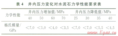 彈性水泥石具備了低楊氏模量、彈性變形能力強(qiáng)的特點(diǎn),能與套管、井壁協(xié)調(diào)變形,有效卸載,大幅度降低微裂隙及微環(huán)隙形成的可能性。由公式(1)(2)計(jì)算出當(dāng)井內(nèi)壓力變化時(shí),為避免水泥環(huán)破壞,需將水泥石楊氏模量降至適當(dāng)范圍(4)。以斯倫貝謝為代表的典型彈性水泥石,楊氏模量在3.55.5GPa,泊松比約為0.22,抗拉強(qiáng)度在2.22.5MPa,在儲(chǔ)氣庫(kù)得到成功應(yīng)用,固井質(zhì)量?jī)?yōu)質(zhì),在經(jīng)過(guò)試壓及下一次開鉆鉆進(jìn)井內(nèi)壓力變化后,固井質(zhì)量依然良好,未出現(xiàn)氣竄。