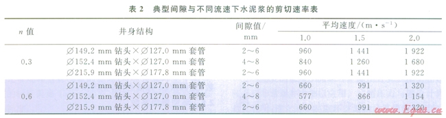 計(jì)算水泥漿流變參數(shù)通常使用旋轉(zhuǎn)黏度計(jì)f300與f100的讀值,其主要考慮到水泥漿在一般環(huán)空中的剪切速率在511s-l與l70s-1之間。但在小間隙環(huán)空中,水泥漿處于高剪切狀態(tài),剪切速率一般大于500s-1,表2給出了典型的環(huán)空間隙與不同流速下的水泥漿剪切速率值的比較情況。
