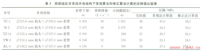 建立的小間隙注水泥環(huán)空流動計(jì)算模型在西部地區(qū)多口非常規(guī)井的注水泥平衡壓力設(shè)計(jì)計(jì)算中加以了應(yīng)用?,F(xiàn)場應(yīng)用結(jié)果表明:小間隙注水泥環(huán)空流動計(jì)算模型計(jì)算出的壓力值接近實(shí)際施工壓力值。表3為西部地區(qū)非常規(guī)井身結(jié)構(gòu)下采用常規(guī)算法和小間隙環(huán)空流動計(jì)算修正方法計(jì)算的壓降值和施工實(shí)際壓力值的比較情況。