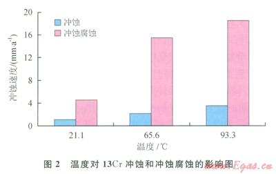 天然氣(無(wú)論是否存在固體顆粒)在一定流動(dòng)速度下將對(duì)生產(chǎn)管柱表面造成沖擊從而使油管發(fā)生磨損,高速流動(dòng)的氣體還足以將油管內(nèi)壁表面黏附不牢的腐蝕產(chǎn)物沖走,或者破壞已形成的保護(hù)性氧化膜,從而加劇腐蝕,降低管柱強(qiáng)度,在往復(fù)的注采過(guò)程中將容易導(dǎo)致油管破裂。研究表明:當(dāng)氣體流速低于臨界沖蝕流速時(shí),沖蝕不明顯;當(dāng)氣體流速高于臨界沖蝕流速時(shí),會(huì)產(chǎn)生明顯的沖蝕,嚴(yán)重影響氣井的安全生產(chǎn)[9]。另外,隨著溫度的增加,流體對(duì)金屬的沖蝕作用和沖蝕腐蝕作用將增強(qiáng)(圖2),因此在設(shè)計(jì)時(shí)除考慮流速的影響外,還需要考慮溫度的因素。