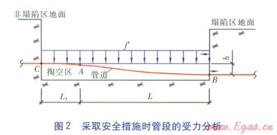 當(dāng)塌陷區(qū)接近或達(dá)到允許沉降量時,點(diǎn)A處的管道將出現(xiàn)失穩(wěn),必須采取安全措施降低當(dāng)量應(yīng)力。安全措施的具體方法為:將管段AB上方的覆土挖走,將土壤荷載卸載。再從點(diǎn)A向塌陷斷裂帶非塌陷區(qū)一側(cè)開挖一段距離到達(dá)點(diǎn)C,并將管段翻下部掏空,以緩解管段AB的彎曲變形,以便較好地應(yīng)對下一次沉降,將管段下部懸空部分填實后回填至沉降后地面高度。在實際操作中我們關(guān)心的是如何確定塌陷斷裂帶非塌陷區(qū)一側(cè)開挖長度。采取安全措施時管段的受力分析見圖2。