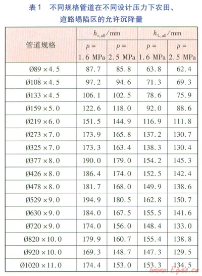 由式(9)~(12)可計算得到,不同規(guī)格管道在設(shè)計壓力分別為1.6、2.5MPa下,農(nóng)田、道路塌陷區(qū)的允許沉降量(見表l)。