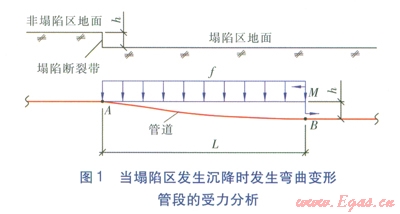 在正常情況下,管道自重(包括供熱介質(zhì)重量)加上部土壤重量等于管道下部土壤的支撐力,無論是有補(bǔ)償管道還是無補(bǔ)償管道,管道不會出現(xiàn)彎曲變形。然而,當(dāng)塌陷區(qū)發(fā)生沉降時,由于管道的連續(xù)性,塌陷斷裂帶的塌陷區(qū)一側(cè)部分管段將發(fā)生彎曲變形(見圖l),并出現(xiàn)懸空現(xiàn)象,使得管道上部出現(xiàn)均布荷載,直至彎曲變形終止。當(dāng)塌陷區(qū)發(fā)生沉降時發(fā)生彎曲變形管段的受力分析見圖l。