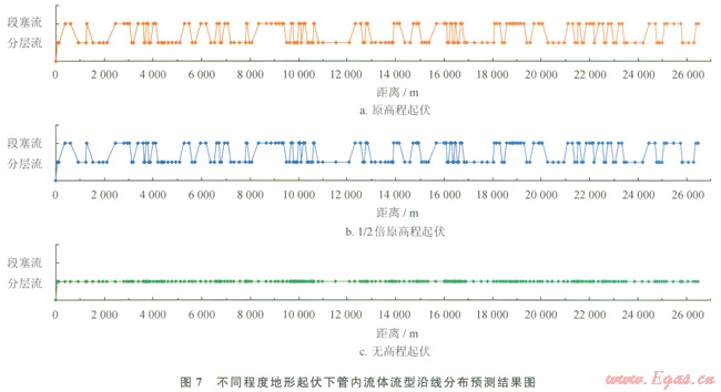 3)地形起伏導(dǎo)致管內(nèi)流體流型極不穩(wěn)定,上傾管路內(nèi)流體流型為段塞流,下傾和水平管路內(nèi)流體流型為分層流;而地形起伏在原高程和1/2原高程兩種狀態(tài)下沿線管內(nèi)流體流型模擬結(jié)果大致相同。