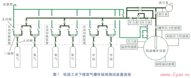 低溫工況下煤層氣爆炸極限的測(cè)試裝置流程按功能分為吹掃流程及引爆試驗(yàn)流程。吹掃流程:在進(jìn)行試驗(yàn)之前必須對(duì)管道進(jìn)行吹掃,即打開(kāi)氮?dú)鈿馄砍隹陂y門(mén),用氮?dú)獯祾哒麄€(gè)回路,由放散管集中排放。引爆試驗(yàn)流程:關(guān)閉氮?dú)鈿馄砍隹陂y門(mén),啟動(dòng)真空泵將低溫爆炸容器抽至-0.02MPa;關(guān)閉真空泵,依次打開(kāi)氮?dú)?、氧氣、甲烷氣瓶,按比例充入到低溫爆炸容器?nèi);待各組分充分混合均勻后利用超低溫試驗(yàn)箱降溫,進(jìn)行引爆試驗(yàn)。低溫工況下煤層氣爆炸極限測(cè)試裝置流程見(jiàn)圖l。