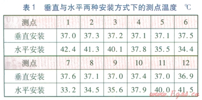 分別對垂直安裝與水平安裝的供熱管道進行測溫,截面設12個測點(見圖2),12個測點均勻分布,測點與絕熱層外表面的距離為20mm,所選擇的測溫截面的絕熱材料比較均勻。垂直與水平兩種安裝方式下的測點溫度見表1。由表1可知:對于垂直安裝供熱管道,l2個測點的平均溫度為37.18℃。對于水平安裝供熱管道,12個測點的平均溫度為37.85℃。對于兩種安裝方式,雖然測點平均溫度基本一致,但是水平安裝供熱管道測點l的溫度最高,比測點7的溫度高9.2℃,這說明水平安裝供熱管道的絕熱層熱導率有明顯的方向性。