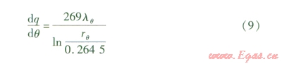 由邊界條件:當r=0.2645m時,微元弧面溫度為270℃;當r= rq時,微元弧面溫度為l℃,可求得式(8)在dq內的解為: