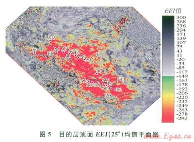 5為從反演得到的EEI(25°)屬性沿目的層頂面開l0ms時(shí)窗提取的算術(shù)平均值平面圖,圖中綠色到紅色對應(yīng)EEI值小于-l50,并且顏色從綠色到紅色對應(yīng)的EEI值逐漸降低。結(jié)合本區(qū)的鉆井情況和構(gòu)造形態(tài)可知,圖5中紅色異常范圍(EEI值小于-150的范圍)與該層鉆井證實(shí)的含氣范圍吻合好。在EEI屬性平面圖上,鉆遇水層的E9井處EEI屬性表現(xiàn)為水層特征,而其他含氣性好的井則對應(yīng)相對低的EEI值,這說明利用EEI屬性能有效地區(qū)分出氣層和水層。另外,A9井區(qū)物性較好的位置主要集中在構(gòu)造高部位,即A9井的周圍,但是分布的范圍較小,這可能就是A9井生產(chǎn)過程中壓力下降較快的一個原因。