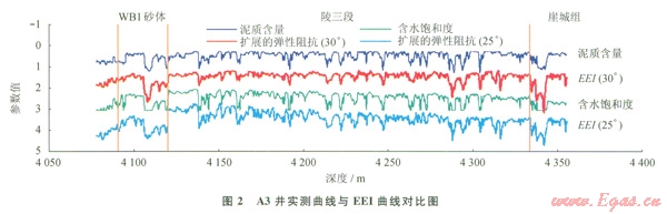 2為相應(yīng)角度的EEI曲線與實(shí)測的泥質(zhì)含量曲線(Vsh)、含水飽和度(Sw)曲線的比較圖,從圖2中可以看出,EEI(30°)與泥質(zhì)含量曲線具有很好的一致性,而EEI(25°)與含水飽和度曲線具有很高的相似度,氣田內(nèi)的其他井也具有類似的情況。