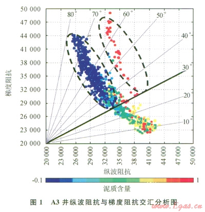 lY氣田目的層段的縱波阻抗(AI)和梯度阻抗(GI)交匯圖,其中色標(biāo)為泥質(zhì)含量(Vsh),可以看出30°的擴(kuò)展彈性阻抗可以較好地區(qū)分砂巖與泥巖。