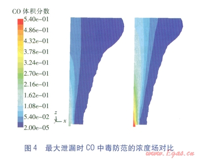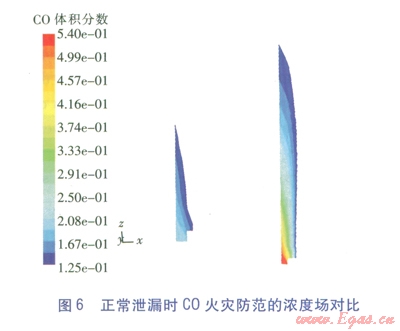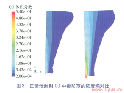 值得一提的是,火災防范時只將爆炸極限列為危害區(qū)間,這符合不發(fā)生明火時的氣體冷態(tài)擴散情況,但一旦發(fā)生燃燒,C0的濃度場將發(fā)生極大變化,還將產(chǎn)生對人員窒息的煙氣。FLUENT作為一款功能強大的軟件,也能模擬燃燒情況(俗稱熱態(tài)研究),但這將大大增加參數(shù)設定的復雜性和計算過程冗時性,這是工程計算力求避免的,但應是理論研究的改進方向。