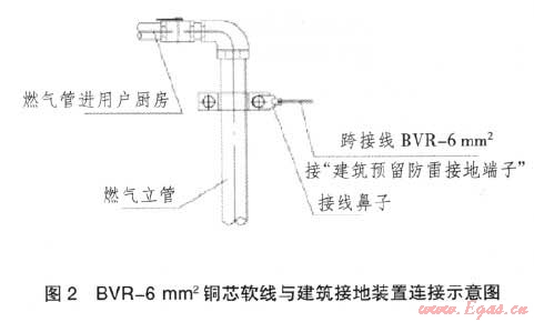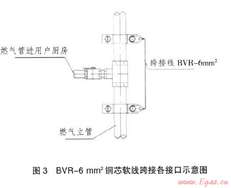 a)對(duì)于采用無縫鋼管的立管,當(dāng)立管高度不大于30m時(shí),燃?xì)饬⒐艿捻敹艘擞?/span>BVR-6mm2銅芯軟線與建筑接地裝置相連,具體做法見圖2。底端與燃?xì)庖牍荛y門連接處用BVR-6mm2銅芯軟線跨接,跨接電阻不大于0.03Ω。對(duì)于燃?xì)饬⒐芨叨葹?/span>30m以上的建筑,需從30m開始,每隔不大于6m(一般為兩層)與建筑預(yù)留的防雷接地端子相連一處,做法與立管頂端的防雷接地做法相同;b)對(duì)于采用鍍鋅鋼管絲扣連接的立管,因各連接口采用聚四氟乙烯生料帶做密封材料,造成立管連接口不導(dǎo)通,各接口處須用BVR-6mm2銅芯軟線跨接,具體做法見圖3。現(xiàn)有一種新型密封膠,導(dǎo)電性能良好,可作為立管絲扣連接的密封材料,現(xiàn)正在研發(fā),若能推廣應(yīng)用,各接口處就無需再做跨接了。
