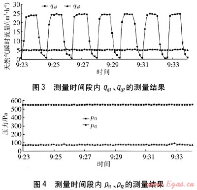 測量時間段內(nèi)qg1、qg2的測量結(jié)果見圖3 pf1,pf2的測量結(jié)果見圖4。上述運行參數(shù)均屬一次運行參數(shù),微燃機發(fā)電機組燃氣化學(xué)熱功率P1、溴化鋰機組補燃燃氣化學(xué)熱功率P2、溴化鋰機組制熱量Φ等屬于二次計算數(shù)據(jù),這些二次計算數(shù)據(jù)由CAT系統(tǒng)計算輸出,部分輸出結(jié)果見圖5。