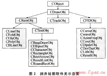 要解決這些問題,采用面向?qū)ο蟪绦蛟O(shè)計理念是最佳的選擇[3]。在圖2軟件主要類的劃分及繼承關(guān)系圖中,CDrawObj類是直接從CObject繼承而來的所有測井圖形類的基類,主要保存著圖形對象的繪圖區(qū)域(m_Rect)和當(dāng)前繪圖文檔的指針(*pDoc),完成光標(biāo)在屏幕上的滾動DoScroll(CScrollView*pView),保存、顯示當(dāng)前光標(biāo)所在位置等功能,它是測井繪圖軟件所有對象動態(tài)識別的入口。
