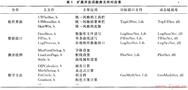 表1為用戶擴展開發(fā)中常用函數(shù)庫,這5類函數(shù)庫都進行了面向?qū)ο蠓庋b,可以較好地滿足各種層次開發(fā)人員的編程需要。表1中簡單地列出了單條曲線(常規(guī)、陣列)管理的基礎(chǔ)類CFIDi0和常規(guī)處理程序數(shù)據(jù)接口函數(shù)類Cl。ogProcess,以及用于測井繪圖和數(shù)據(jù)分析的函數(shù)類;C++程序開發(fā)人員可以按照Microsoft Visual Studio.net規(guī)則調(diào)用其中的類或函數(shù)來輕松完成用戶所需要的二次開發(fā)。