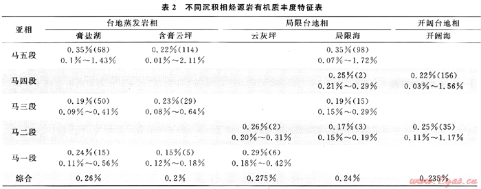 從中可見:馬五段膏鹽湖和局限海有機質(zhì)豐度最高,均為0.35%;而含膏云坪微相較低,僅為0.22%;在馬四段,沉積環(huán)境差異導(dǎo)致有機質(zhì)豐度不同的現(xiàn)象較明顯,局限海有機質(zhì)豐度明顯比開闊海高,兩者分別為0.25%和0.22%;馬三段盡管形成于水體相對封閉的環(huán)境,但是各微相有機質(zhì)豐度均很低;馬二段與馬四段類似,即局限臺地比開闊臺地有機質(zhì)豐度略高,云灰坪有機碳含量為0.26%,開闊海為0.25%;馬一段云灰坪和膏鹽湖有機碳含量較高,分別為0.29%和0.24%。