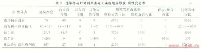 從選取的井并結(jié)合野外剖面點(diǎn)的巖性組合、變化情況等可以看出(表2),除去臨7井為膏鹽沉積外,龍王廟組沉積自西向東隨著水深的變化,整體厚度變大,顆粒灘沉積厚度也變大,沉積巖性的變化是由全部的白云巖沉積到開(kāi)始出現(xiàn)石灰?guī)r沉積,最后到石灰?guī)r占整個(gè)龍王廟組的大部分,只有上部存在少量的白云巖的一個(gè)漸變過(guò)程。高石梯 磨溪地區(qū)是白云巖灘最發(fā)育的地區(qū),秀山高東廟剖面代表的中緩坡區(qū)域沉積的灘體多為石灰?guī)r灘。