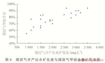 該區(qū)含氣量與礦化度呈正相關(guān)關(guān)系(圖2),東南部地層水礦化度小于1200mg/L的區(qū)域煤層含氣量一般小于2m3/t,而北部地層水礦化度大于1700mg/L的區(qū)域煤層含氣量一般大于4m3/t。同時(shí),煤層氣井產(chǎn)出水礦化度與煤層甲烷含量之間相關(guān)性較好(圖6),煤層甲烷含量隨礦化度增加而增加,東南部煤層氣井產(chǎn)出水礦化度低于1200mg/L的地區(qū),煤層甲烷含量一般低于70%,而北部煤層氣井產(chǎn)出水礦化度高于1700mg/L,煤層甲烷含量一般大于80%。說(shuō)明東南部距離補(bǔ)給區(qū)較近,地下水活躍,不利于煤層氣的保存,而北部遠(yuǎn)離水源補(bǔ)給區(qū),水動(dòng)力處于弱徑流區(qū)一滯留區(qū),保存條件好。另外,總體上北部煤層氣井產(chǎn)氣效果也明顯好于東南部,也說(shuō)明北部煤層氣富集條件優(yōu)于東南部。