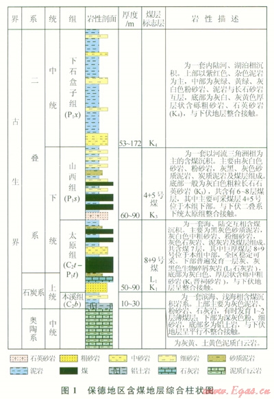 保德地區(qū)行政區(qū)劃位于山西省西北部,構(gòu)造上位于鄂爾多斯盆地東緣晉西撓曲帶北段,總體上表現(xiàn)為向西傾的單斜構(gòu)造,地層傾角介于5°~l0°,斷裂構(gòu)造不甚發(fā)育[1],含煤地層為上石炭統(tǒng)一下二疊統(tǒng)太原組和下二疊統(tǒng)山西組(圖1)。區(qū)內(nèi)發(fā)育煤層15~16層,山西組4+5號(hào)煤層和太原組8+9號(hào)煤層為主要煤層。其中,4+5號(hào)煤層單層厚度介于5~14.6m,平均為7.6m;8+9號(hào)煤層單層厚度介于5~14.2m,平均為l0.2m。