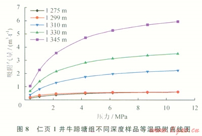 仁頁(yè)l井樣品等溫吸附實(shí)驗(yàn)共測(cè)定7個(gè)平衡壓力點(diǎn),每個(gè)壓力點(diǎn)達(dá)到平衡的時(shí)間約為12h,然后再增壓到下一個(gè)壓力點(diǎn),實(shí)驗(yàn)采用的甲烷氣濃度均大于99.999%。仁頁(yè)l井樣品等溫吸附曲線見圖8。