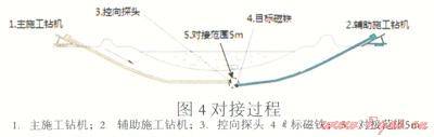 對接穿越需要在穿越曲線入、出土點兩端各架設一臺鉆機,在鉆桿短節(jié)內(nèi)內(nèi)安置感應探頭與目標磁鐵,兩臺鉆機分別進行導向孔頂進,當兩臺鉆機的鉆頭鉆至預定對接點,并且兩鉆頭距離在探測范圍內(nèi)時,由入土點鉆機的探頭感應出土點鉆機鉆頭安裝的目標磁鐵發(fā)出的磁信號,兩臺鉆機械調(diào)操作,入土點鉆機鉆機,出土點鉆機回抽鉆桿,直至兩臺鉆機的導向孔完全吻合(如圖1)