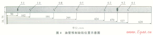 取一根實際作業(yè)使用過,長度為620mm的連續(xù)油管,利用線切割工藝在油管上預(yù)制了裂縫深度分別為0.1mm、0.3mm、0.5mm、0.8mm、1mm共5個缺陷(圖4)。
