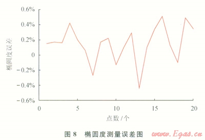 圖7中綠色曲線為檢測系統(tǒng)對該油管的測量結(jié)果,紅色曲線為游標卡尺所測量的理論值曲線。黑色曲線中有2處橢圓度測量值比較大,其橢圓度測量值分別為5.6%、9.7%,這與預(yù)制缺陷的位置及理論值一致。圖8為游標卡尺所測量理論值與檢測系統(tǒng)的檢測結(jié)果的對比曲線,從圖8中可以看出,誤差最大值為0.55%,測量精度達到l%。