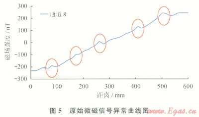 實驗過程中,連續(xù)油管以1m/s的速度(實際作業(yè)時的速度)在機械裝置中抽動。圖5是某通道原始磁信號曲線,可以看出分別在95mm、185mm、298mm、421mm、525mm處出現(xiàn)了向上(因為用線切割預(yù)制的缺陷類似裂紋、腐蝕缺陷)的磁信號異常,這就是工件上所預(yù)制的5個人工缺陷。圖6檢測結(jié)果二維成像圖更加明顯,直觀表示了這些缺陷和大小。圖4表明了5個缺陷在油管上準確位置分別是l02mm、191mm、295mm、424mm、527mm,這與實際檢測的位置相比最大絕對誤差為7mm(第1個缺陷),相對誤差不到1%。