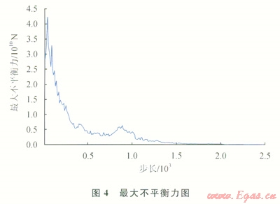 數(shù)值分析采用迭代方法計算,在迭代過程中監(jiān)控一些變量或參數(shù)的變化,以判斷分析結果是否正確,模型是否與實際相符[6-7]。監(jiān)控模型最大不平衡力,所謂體系最大不平衡力,是指每一個計算循環(huán)中,外力通過網(wǎng)格節(jié)點傳遞分配到體系各節(jié)點時,所有節(jié)點的外力與內(nèi)力之差中的最大值。如圖4~6監(jiān)控了最大不平衡力,并記錄了位移等值線圖和應力等值線圖。