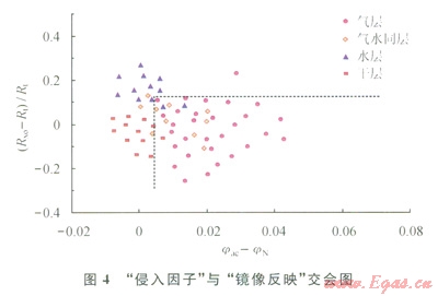 結(jié)合基于淡水鉆井液侵入特征分析以及聲波孔隙度和中子孔隙度的“鏡像反映”特征。通過引入“侵入因子”[(Rxo-Rt)/Rt],其中Rxo、Rt分別為中、深感應(yīng)測(cè)井值,建立“侵入因子”與“鏡像反映”(jac-jN)的交會(huì)圖,可以有效地識(shí)別氣水層(圖4)。