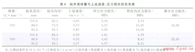 當(dāng)洗井的排量達(dá)到500Lmin時,最小上返速度0.52ms,累計壓力損失23.95MPa,能夠順利帶出12mm及以下直徑的水泥塊(6),基本滿足洗井要求。