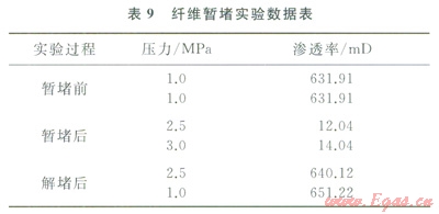 通過試驗(yàn)數(shù)據(jù)(8)可以看到,在60℃以上,纖維在鹽酸中能夠很好地降解。暫堵后,纖維能夠顯著降低巖心的滲透率,通過酸化解堵,巖心滲透率能夠完全恢復(fù)(9)。