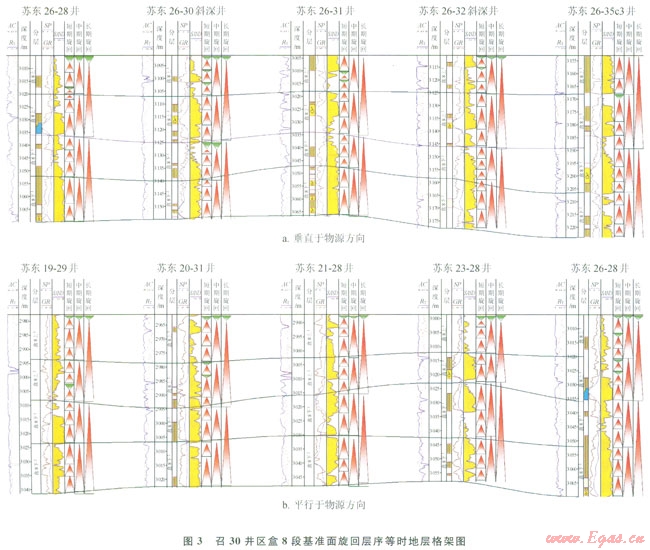 蘇里格地區(qū)盒8段砂體構(gòu)型可分為復(fù)合河道砂體和單一河道砂體,前者被稱為疊置河道砂,后者被稱為單河道砂。本文以層序地層學(xué)理論為依據(jù),在層序地層界面識別的基礎(chǔ)上,建立了召30井區(qū)盒8段高分辨率層序地層格架,通過中期基準(zhǔn)面的對比識別出疊置河道砂,進(jìn)而通過短期基準(zhǔn)面的對比識別出單河道砂,并定量刻畫該地區(qū)盒8段河道帶及河道砂體規(guī)模,建立儲集砂體構(gòu)型,以期為氣田開發(fā)過程中的井距優(yōu)化和天然氣“甜點(diǎn)”的選擇提供依據(jù),提高氣田開發(fā)效益。