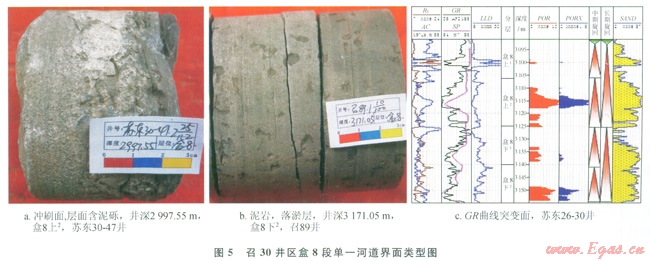 單一河道是指較長周期的大洪水期形成的具有一定分布范圍的河道單元,其識別的意義在于復(fù)合河道內(nèi)垂向上的單一河道單元的劃分,每一期次洪水的流量、流速不盡相同。因此可以依據(jù)河道內(nèi)的泥質(zhì)層、細(xì)粒沉積的發(fā)育位置、沖刷面以及測井曲線的突變來對其進(jìn)行識別[20]。區(qū)內(nèi)單一河道的界面表現(xiàn)為(圖5):①沖刷面,代表洪水對前期沉積物的改造,多含泥礫;②泥巖及粉砂巖沉積,代表憩水期水體能量相對較弱時(shí)的細(xì)粒沉積,保存程度視后一期洪水能量的強(qiáng)弱而定;③測井曲線(GR)突變面。通過以上3種界面對召30井區(qū)盒8段短期基準(zhǔn)面旋回內(nèi)單一河道進(jìn)行識別,每個(gè)短期旋回內(nèi)均發(fā)育2~3期單一河道沉積。