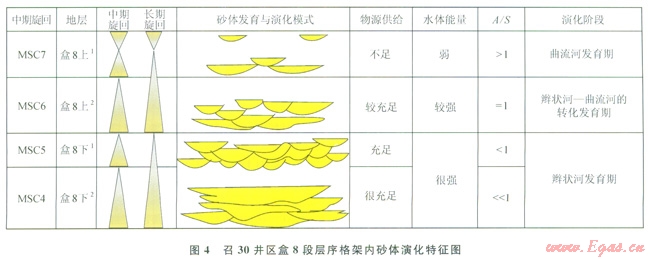 LSC2即盒8段上部層序由2個(gè)中期旋回(MSC3~MSC4)組成,底部旋回(MSC3)為向上變“深”的非對稱型,該中期旋回由2~3個(gè)(SSC7~SSC9)短期旋回組成,短期旋回由A型(向上“變深”非對稱型)向C型(對稱型)過渡,表明基準(zhǔn)面有所抬升,可容納空間增大;頂部旋回(MSC4)為以上升半旋回為主的不完全對稱型,此時(shí)源區(qū)構(gòu)造相對穩(wěn)定,物源供給量相對減少,基準(zhǔn)面抬升,可容納空間增大,A/S值大于1,該中期旋回由2~3個(gè)短期旋回組成(SSCl0~SSCl2)。
