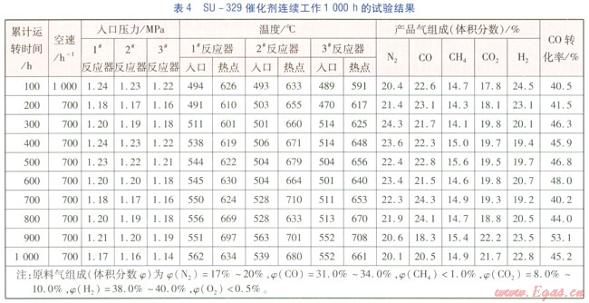 1#反應(yīng)器入口壓力為1.15~1.25MPa,1#反應(yīng)器入口溫度為490~560℃,原料氣中CO體積分數(shù)為31%~34%的穩(wěn)定運轉(zhuǎn)條件下,SU-329催化劑原料氣的低熱值比為1.17左右,產(chǎn)品氣的低熱值為 連續(xù)工作1000h的試驗結(jié)果見表4。