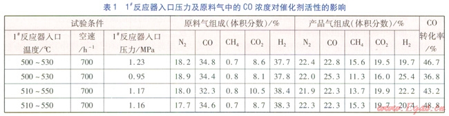 1#反應(yīng)器入口壓力及原料氣中CO的濃度均有一定波動,會影響催化劑的活性,對此進行了試驗,試驗條件及結(jié)果見表1。