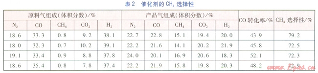 由表l可知,當原料氣中CO濃度基本相同時,在1#反應(yīng)器入口溫度相同的條件下,隨著1#反應(yīng)器入口壓力的降低,產(chǎn)品氣中的CH4含量和CO轉(zhuǎn)化率下降明顯,這說明催化劑活性對壓力變化很敏感。當1#反應(yīng)器人口壓力幾乎不變時,在1#反應(yīng)器入口溫度相同的條件下,隨著原料氣中CO濃度的降低,產(chǎn)品氣中的CH4含量和CO轉(zhuǎn)化率也隨之下降。