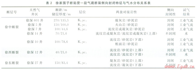 由表l中可以看出,徐家圍子斷陷日前已發(fā)現(xiàn)的氣藏,如徐深1—徐深6井區(qū)、徐深7井區(qū)、徐深41徐深l7井區(qū)、徐深14—徐深l2井區(qū)、徐深12井區(qū)、徐深27井區(qū)、徐深9井區(qū)、徐深l3—肇深11井區(qū)營一段火山巖氣藏皆為受三大斷裂遮擋形成的氣藏,其在天然氣運聚成藏期——青山口組沉積之后至今在側向上是否封閉是決定氣藏能否形成的關鍵。