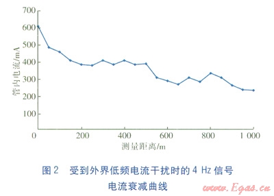 一般情況下,管道內(nèi)的信號電流應(yīng)該隨著測量距離的增大而不斷衰減,但是當(dāng)存在外界低頻電流干擾時,4Hz的信號電流會出現(xiàn)突然反彈或者波動的現(xiàn)象,受到外界低頻電流干擾時的4Hz信號電流衰減曲線見圖2[6]。外界干擾的低頻電流會與檢測中使用的4Hz低頻信號電流互相作用,產(chǎn)生疊加或抵消,當(dāng)疊加時,會出現(xiàn)圖2中信號電流反彈升高的情況;當(dāng)?shù)窒麜r,會出現(xiàn)信號電流驟然變小的情況。無論是疊加還是抵消,都會對防腐層的檢測結(jié)果產(chǎn)生很大影響,甚至嚴重失真。