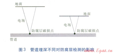 一般地,城鎮(zhèn)燃氣管道各處埋深不同。不同的管道埋深將會對防腐層破損點處泄漏電流產(chǎn)生的電場產(chǎn)生很大影響。假設(shè)管道防腐層的破損情況相同、周圍土壤電阻率變化不大,當(dāng)管道埋深較小時,從防腐層破損點向外傳導(dǎo)的電流相對集中,在地面上檢測到的電流較大;而當(dāng)管道埋深較大時,在地面上檢測到的電流較小(見圖3)。