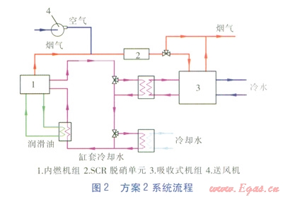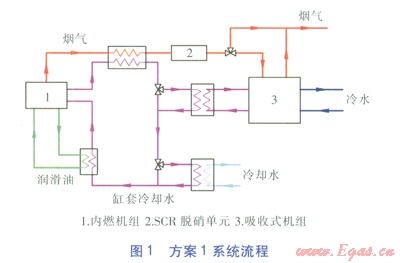 方案1系統(tǒng)流程見圖1。內(nèi)燃機(jī)組煙氣經(jīng)煙氣—水換熱器后進(jìn)入SCR脫硝單元,脫硝后進(jìn)入煙氣熱水型溴化鋰吸收式冷水機(jī)組(以下簡稱吸收式機(jī)組),放熱后與過剩煙氣一同排放。缸套冷卻水分別經(jīng)兩級換熱器降溫后,再吸收潤滑油部分熱量,最終回到內(nèi)燃機(jī)組缸套。