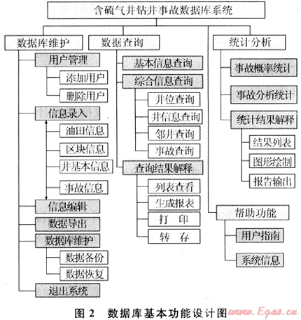 鉆井事故數(shù)據(jù)庫系統(tǒng)主要有如下5大功能模塊:①數(shù)據(jù)管理:完整的數(shù)據(jù)錄入、編輯、刪除等操作。數(shù)據(jù)庫管理設(shè)計的關(guān)鍵問題是如何避免記錄重復(fù)添加、規(guī)范數(shù)據(jù)的輸入格式以及一定的容錯性。a.避免記錄重復(fù),新數(shù)據(jù)與數(shù)據(jù)庫內(nèi)原有記錄不能完全相同。若新輸入的數(shù)據(jù)在數(shù)據(jù)庫中已存在給出提示。b.數(shù)據(jù)庫格式規(guī)范化,數(shù)據(jù)庫對于所輸入的數(shù)據(jù)必須經(jīng)過一定的后臺處理后,才能存儲到數(shù)據(jù)庫文件中。為了保證數(shù)據(jù)存儲的準(zhǔn)確性,該數(shù)據(jù)庫系統(tǒng)對所輸入數(shù)據(jù)的格式進(jìn)行了規(guī)定。c.容錯性,若對每一個數(shù)據(jù)項(xiàng)都進(jìn)行嚴(yán)格的規(guī)定,這無疑會引起數(shù)據(jù)錄入人員的反感,對數(shù)據(jù)錄入人員的技術(shù)水平也提出更高的要求,有些字段沒有必要進(jìn)行嚴(yán)格的格式限制。因此,充分利用Visual Basic內(nèi)部的字符轉(zhuǎn)化程序,有些字段沒有進(jìn)行格式限制,從而保證系統(tǒng)有一定的容錯性。d.數(shù)據(jù)的完整性,在數(shù)據(jù)編輯過程中所要考慮的首要問題是數(shù)據(jù)庫采用關(guān)系型數(shù)據(jù)庫,同一字段會在多個表中出現(xiàn),在數(shù)據(jù)的修改、刪除操作時,須保證數(shù)據(jù)庫的整體完整性。②數(shù)據(jù)庫備份與恢復(fù):對現(xiàn)有的數(shù)據(jù)庫內(nèi)數(shù)據(jù)定期進(jìn)行數(shù)據(jù)備份,防止由于系統(tǒng)問題或誤操作造成的數(shù)據(jù)丟失。a.備份文件名稱命名規(guī)則“database”+“備份的日期”(例如2008年5月29日備份的文件名:database20080529.mdb)。b.系統(tǒng)恢復(fù)功能,當(dāng)數(shù)據(jù)庫內(nèi)部數(shù)據(jù)出現(xiàn)錯誤或者誤操作引起數(shù)據(jù)丟失時,利用先前備份的數(shù)據(jù)庫文件,將數(shù)據(jù)庫恢復(fù)到指定日期。③查詢功能:數(shù)據(jù)庫的查詢功能是數(shù)據(jù)庫的核心功能,該數(shù)據(jù)庫系統(tǒng)共設(shè)計有5種查詢。a.數(shù)據(jù)導(dǎo)航式查詢,將數(shù)據(jù)庫系統(tǒng)所存儲數(shù)據(jù)以樹形結(jié)構(gòu)進(jìn)行顯示,以方便使用者查詢。數(shù)據(jù)導(dǎo)航式查詢采用“油氣田→區(qū)塊→井→事故”四級導(dǎo)航模式數(shù)據(jù)庫。b.區(qū)塊井位查詢,輸入?yún)^(qū)塊/井名稱查詢井位,有信息則在窗體右邊區(qū)域顯示,若沒有信息則給出數(shù)據(jù)庫中無信息的提示,在顯示區(qū)域可提前設(shè)定顯示比例。c.井的基本信息查詢,多種條件下的復(fù)合檢索,最多支持3個查詢條件。根據(jù)查詢條件的邏輯關(guān)系,在“邏輯關(guān)系”列表框中選擇“并且、或者”。d.鄰井查詢,以井口坐標(biāo)為依據(jù)查詢鄰井,可以自定義查找半徑。e.事故查詢,事故地質(zhì)、鉆井工藝、鉆井液性能、井口設(shè)備以及事故特征參數(shù)查詢。④統(tǒng)計功能,利用標(biāo)準(zhǔn)SQL語句可以對數(shù)據(jù)庫中的數(shù)據(jù)進(jìn)行統(tǒng)計、求和等,然后利用Visual Basic中的Ms-chart控件實(shí)現(xiàn)統(tǒng)計結(jié)果的繪圖功能。⑤數(shù)據(jù)導(dǎo)出功能:根據(jù)用戶需要將特定的信息從數(shù)據(jù)庫導(dǎo)出到word或者excel文本中。⑥自動報表功能:根據(jù)數(shù)據(jù)庫所存數(shù)據(jù),按照油氣田標(biāo)準(zhǔn)格式打印用戶指定信息。